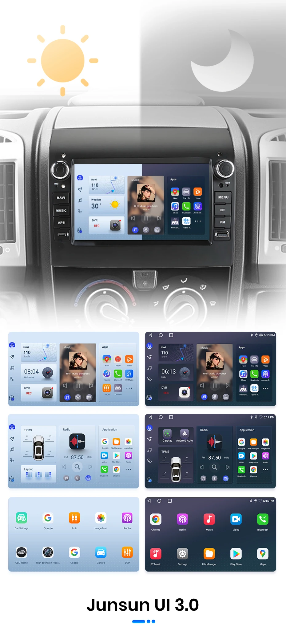 The screen is upgraded to IPS with resolution of 1280*720, which brings better color accuracy, contrast,and brightness. Enjoy immersive visual experience and easy operation on the 9/10 Inch big screen. Comes with Junsun UI themes that you can choose from, support day and night model, provide you a safer & comfortable driving experience especially at night.