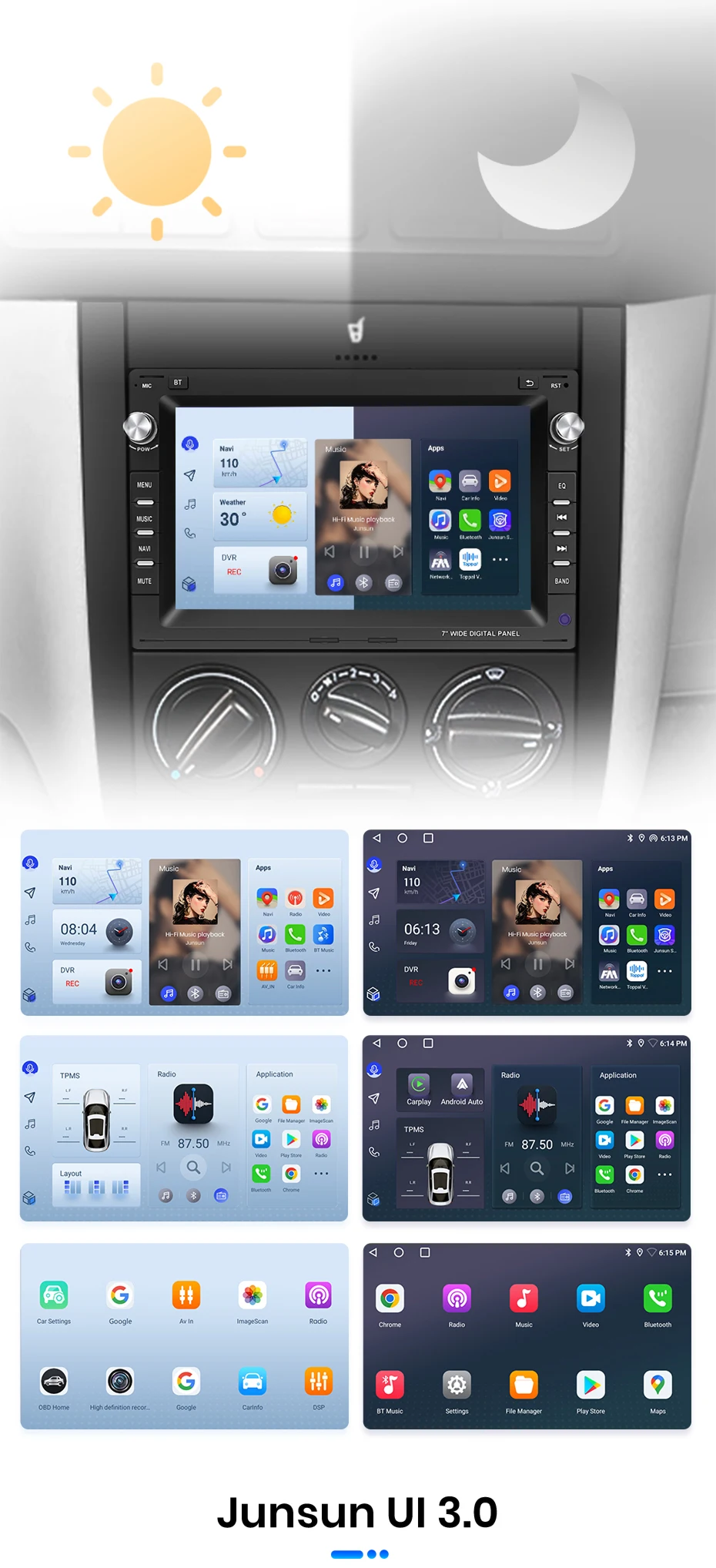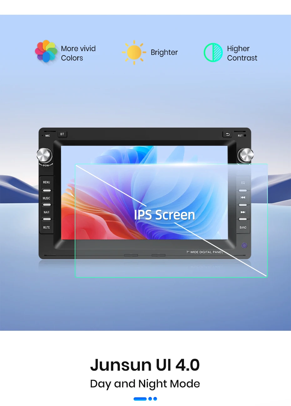 The screen is upgraded to IPS with resolution of 1280*720, which brings better color accuracy, contrast,and brightness. Enjoy immersive visual experience and easy operation on the 9/10 Inch big screen. Comes with Junsun UI themes that you can choose from, support day and night model, provide you a safer & comfortable driving experience especially at night.