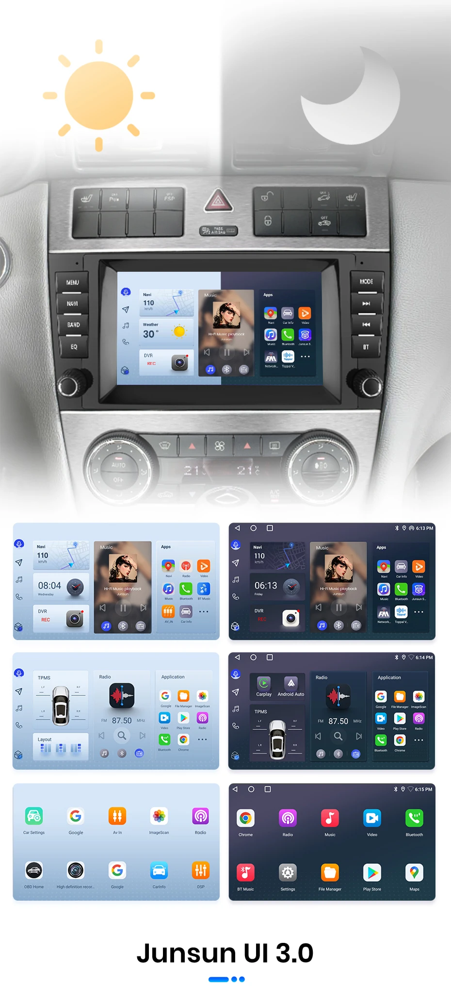 【IPS Display Car Head Unit】The screen is upgraded to IPS with resolution of 1024*600, which brings better color accuracy, contrast,and brightness. Enjoy immersive visual experience and easy operation on the 9/10 Inch big screen. Comes with Junsun UI themes that you can choose from, support day and night model, provide you a safer & comfortable driving experience especially at night.
