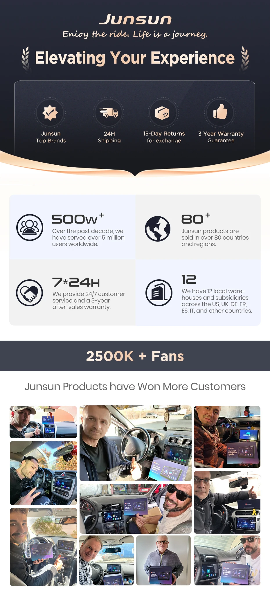 1. Junsun Brand Official Store, we're committed to delivering authentic, original products. Junsun has earned the trust of over 2 million fans and has served more than 5 million users globally for over a decade. Choose Junsun for dependable, cutting-edge car equipment that enhances your driving experience with both safety and intelligence.
