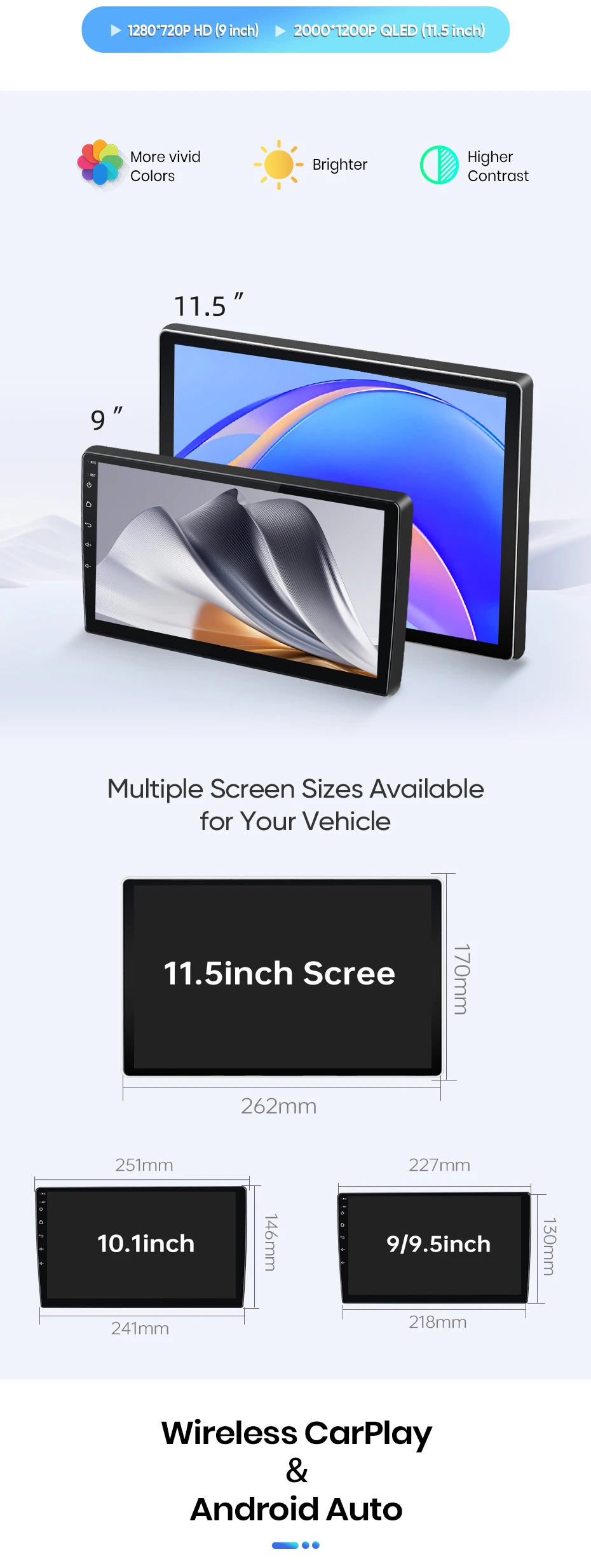4.Screen Mirroring: Mirror your iOS/Android smartphone display onto the 9.5/10.1/11.5-inch touchscreen for easy access to apps, videos, and content.