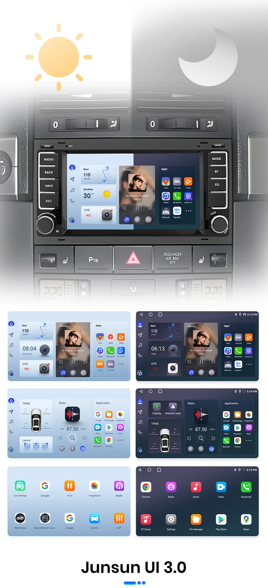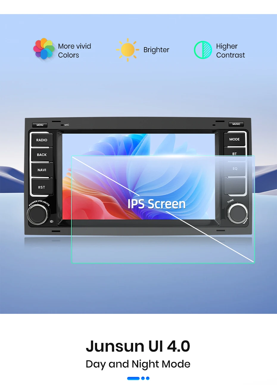 The screen is upgraded to IPS with resolution of 1280*720, which brings better color accuracy, contrast,and brightness. Enjoy immersive visual experience and easy operation on the 9/10 Inch big screen. Comes with Junsun UI themes that you can choose from, support day and night model, provide you a safer & comfortable driving experience especially at night.