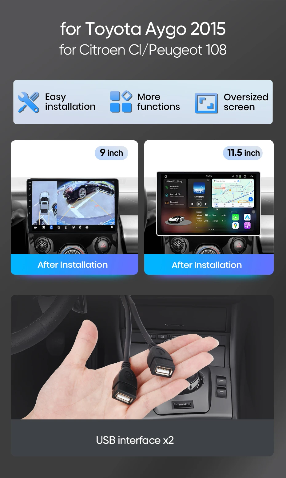 For Peugeot 108 Citroen C1 Toyota Aygo 2014 - 2021 Cars have many different configurations. Different car configurations require different power cables/center console frames. If your car is "automatic air conditioning", please do not buy it. The product is not compatible.